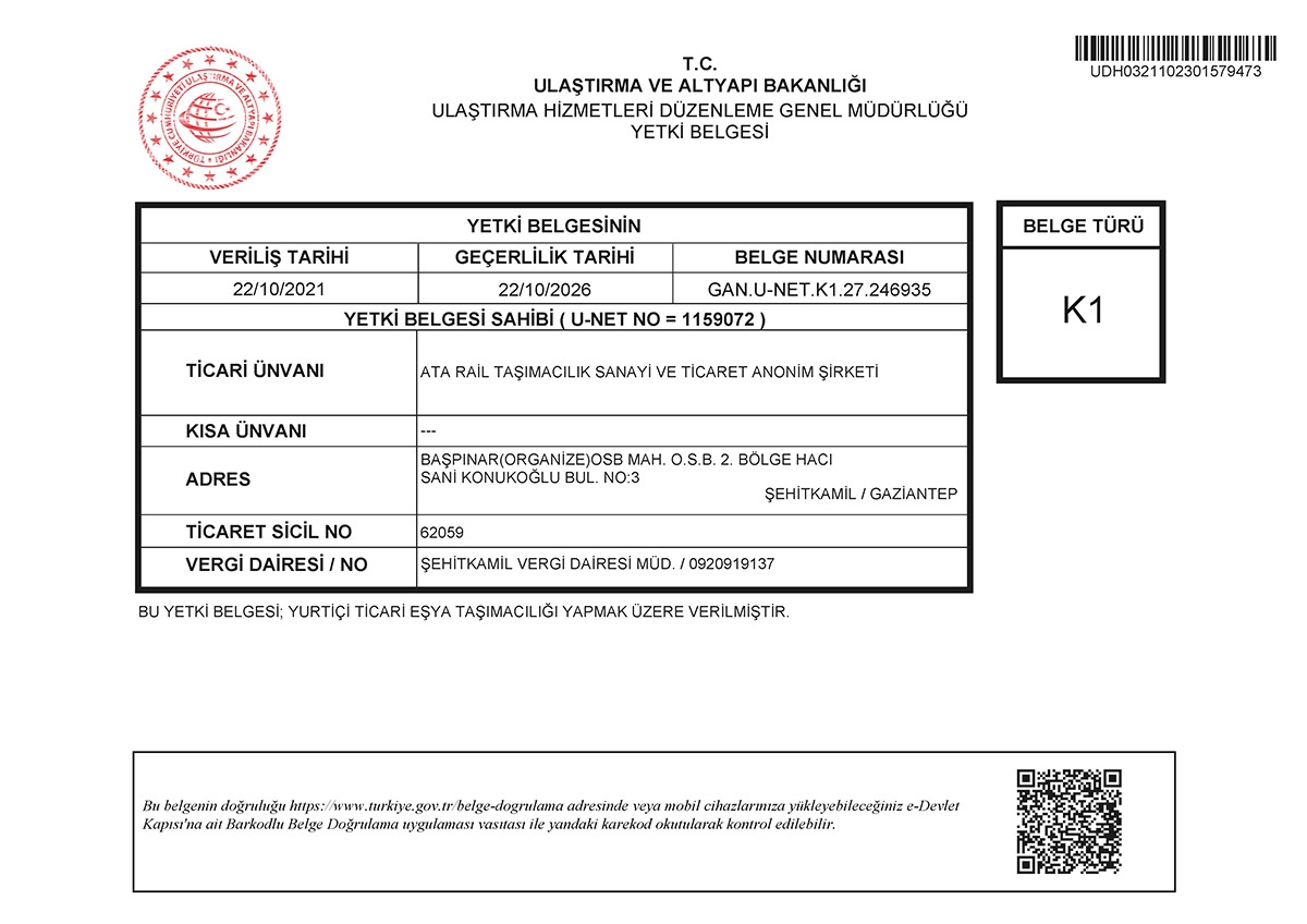 Ata Rail K1 Yetki Belgesi